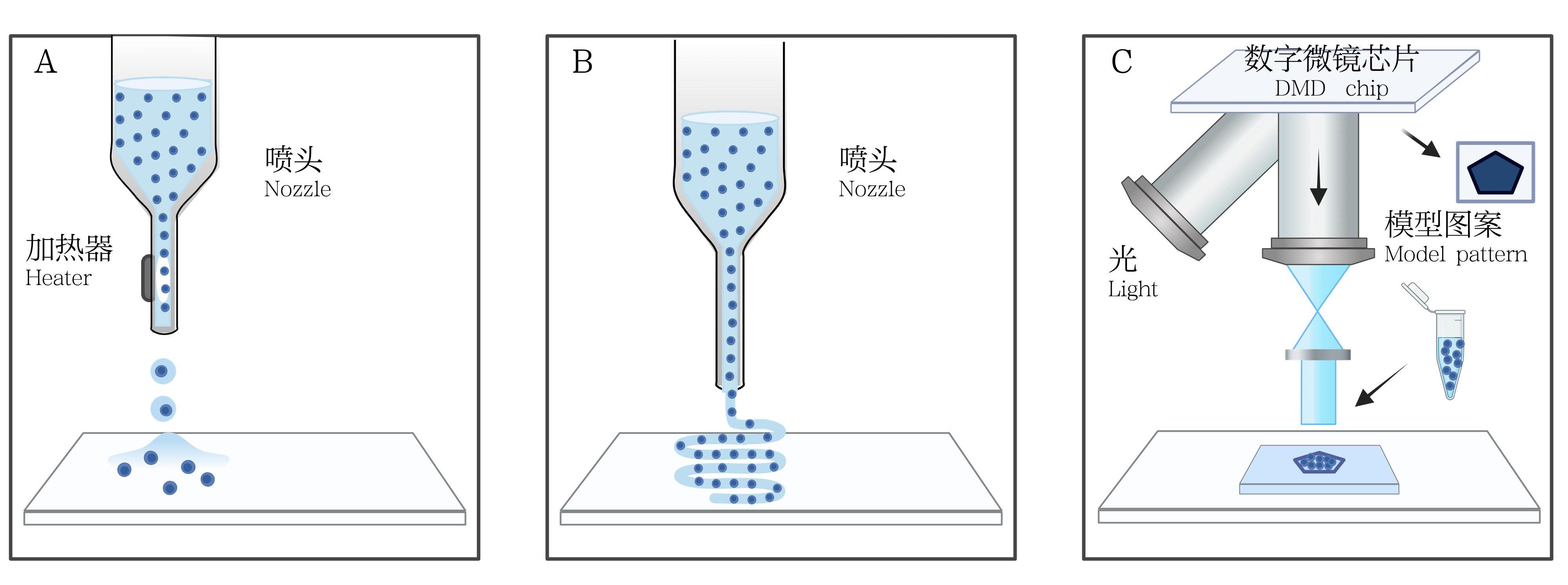 图1 3种生物3D打印工艺类型的工作机制示意图 注:A,喷墨式生物3D打印(局部加热生物墨水,并膨胀一个气泡以推动液滴从喷嘴头喷出);B,挤出式生物3D打印(逐层打印连续的细丝状生物墨水);C,光固化生物3D打印[利用数字微镜装置(DMD)芯片,使得紫外光或其他光源模式化投射到生物墨水上]。