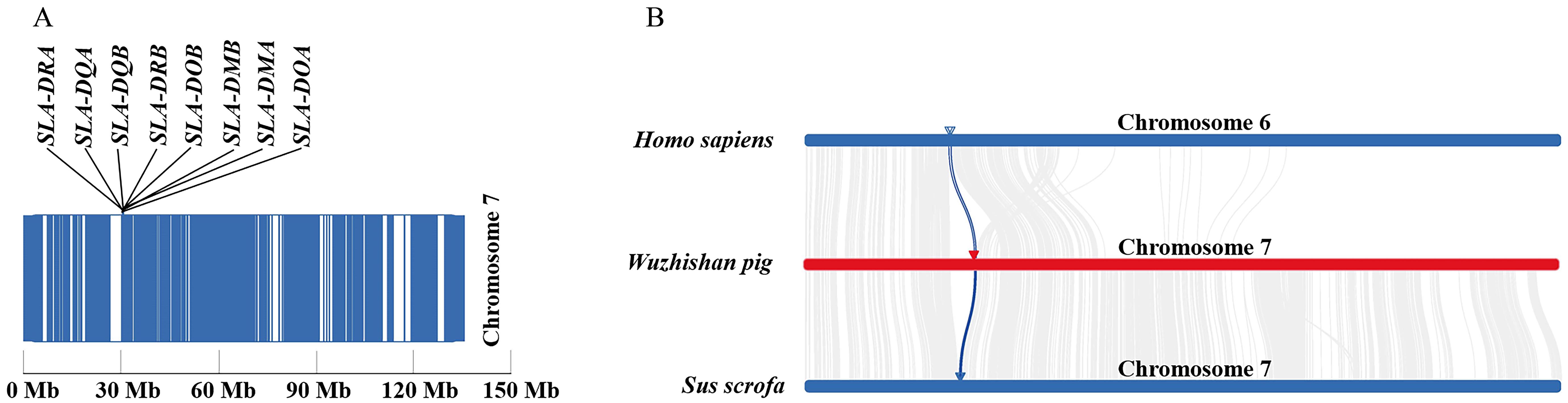 | Figure 4 Chromosomal localization of MHCⅡ genes on chromosome 7 in Wuzhishan pigs(A)and syntenic relationship analysis of MHCⅡ genes between Wuzhishan pigs, Homo sapiens and Sus scrofa(B) |