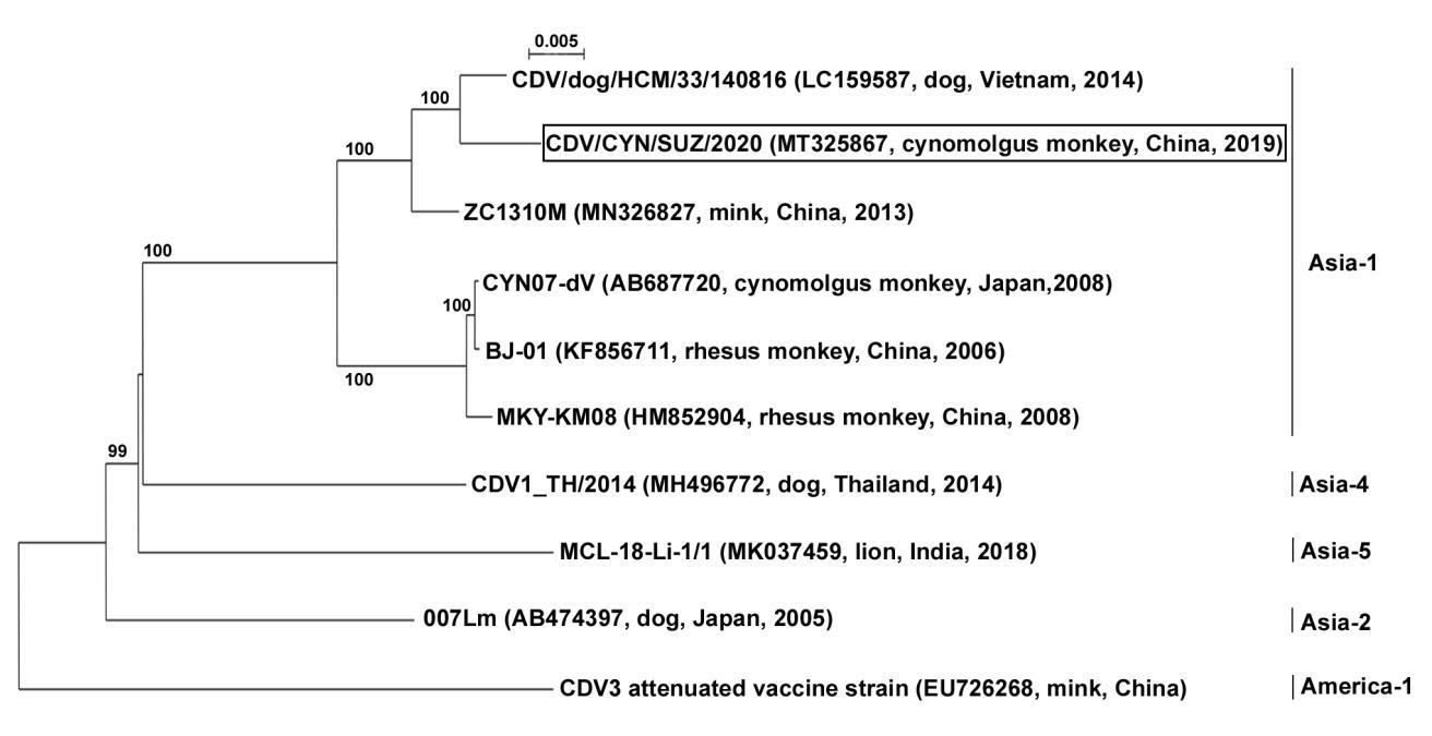 | Figure 4 Phylogenetic analysis based on full-length open reading frame sequences of different CDV strains (the CDV strain newly isolated from the skin tissue of the deceased monkey in this study is marked with a black box) |