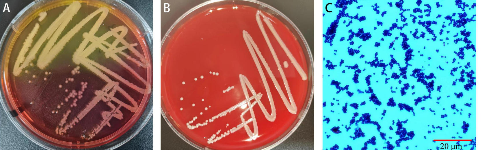 | Figure 2 Colony morphology on mannitol salt agar plate (A) and blood agar plate (B) and Gram staining microscopic examination (C) of the isolated strain |
