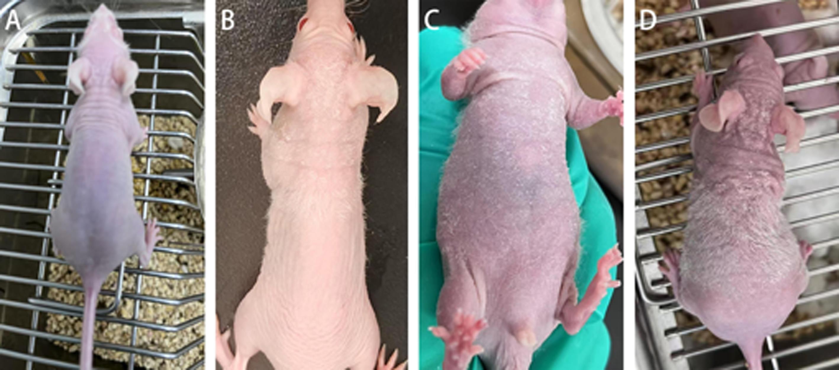 Figure 4 Clinical manifestations of scaling in different groups of nude mice infected with isolated bacterial suspension Note: A, Control group of applying physiological saline solution to the skin on the neck and back; B, Low concentration group of 1.8×107 CFU/mL isolated bacterial solution applied to the skin on the neck and back; C, Abdominal symptoms in the high concentration group of isolated bacterial solution with a concentration of 1.8×108 CFU/mL applied to the skin on the neck and back; D, Back symptoms in the high concentration group treated with 1.8×108 CFU/mL isolated bacterial solution applied to the skin on the neck and back.