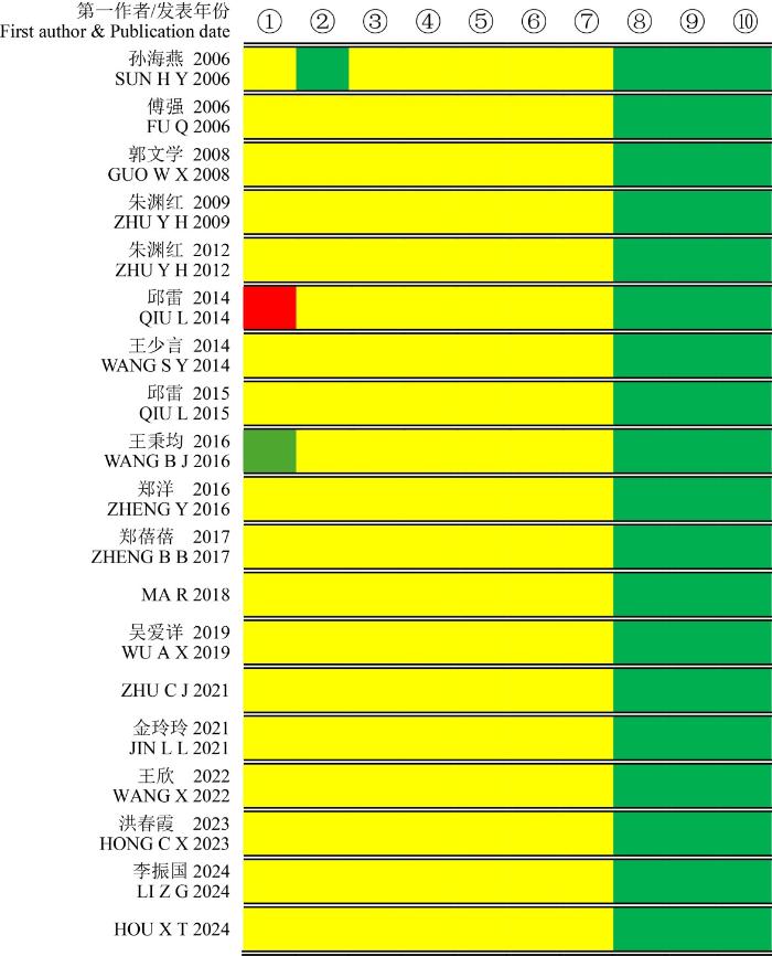 研究文献由两位研究者收集,采用SYRCLE偏倚风险工具[10]对纳入文献的动物实验报告进行质量评估,通过协商、沟通确保数据准确。当对评估结果存在分歧时,由本文通信作者组织讨论,协商决定纳入文献最终评估结果。