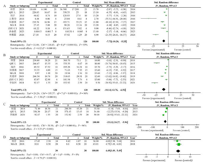 共有4篇文献报告了黄芪注射液对动物血清中AMY水平的影响。异质性分析结果表明,各研究间存在高度异质性(I2 =93%,P<0.000 01)。Meta分析结果显示,在昆明小鼠和SD大鼠动物实验中,黄芪注射液能降低AMY水平[SMD=-4.30,95%置信区间(confidence interval,CI)(-6.78,-1.83)],结果具有统计学意义(图3A)。