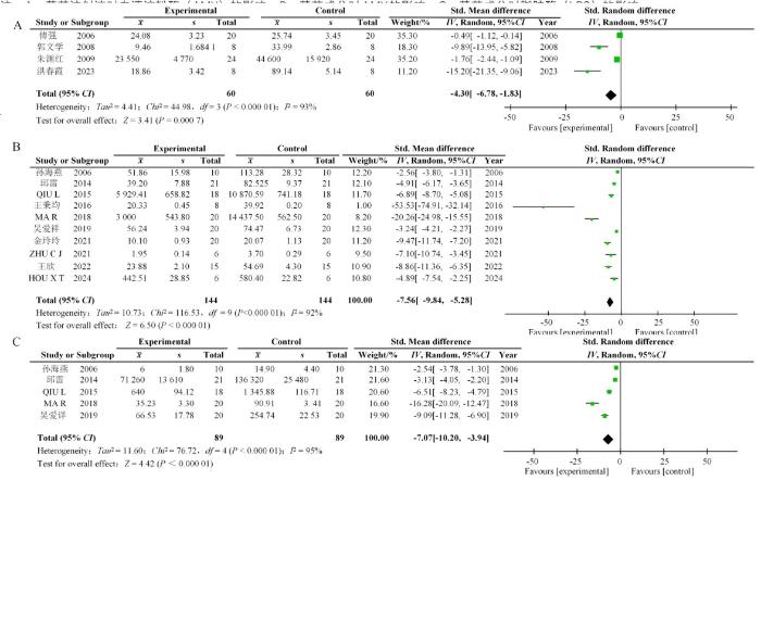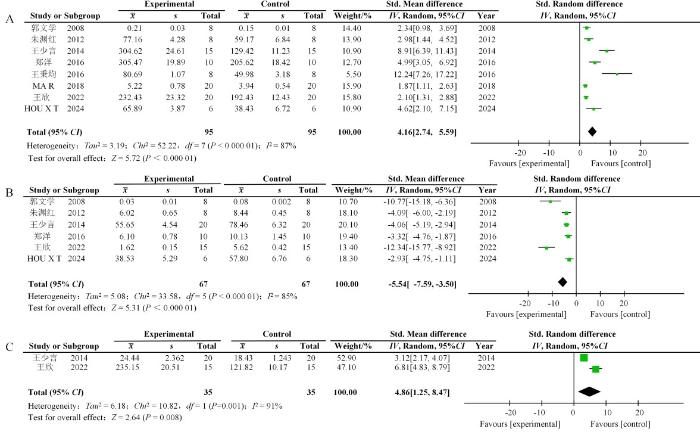 共有8篇文献报道了黄芪注射液或黄芪成分在AP疾病进展中对氧化/抗氧化平衡相关氧化因子的影响。其中8篇文献均涉及超氧化物歧化酶(superoxide dismutase,SOD)指标,Meta分析结果显示,黄芪注射液或黄芪成分能抑制SOD的下调[SMD=4.16,95%CI(2.74,5.59)](图5A);有6篇文献报道了黄芪注射液或黄芪成分对丙二醛(malondialdehyde,MDA)的作用,Meta结果表明它们能降低MDA的水平[SMD=-5.54,95%CI(-7.59,-3.50)](图5B);有2篇文献显示黄芪注射液和黄芪总皂苷能抑制谷胱甘肽过氧化物酶(glutathione peroxidase,GSH-Px)的下调[SMD=4.86,95%CI(1.25,8.47)](图5C)。
