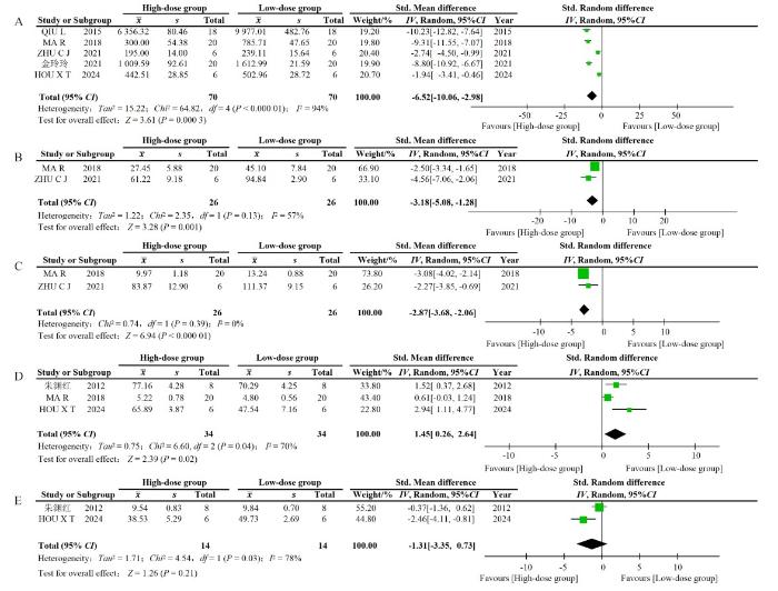 共有6篇文献研究设置了高、低剂量组,干预药物包括黄芪注射液、黄芪总皂苷、毛蕊异黄酮,涵盖AMY、TNF-α、IL-6、SOD、MDA 5项指标。黄芪注射液及黄芪成分的给药剂量与AP实验动物指标之间的Meta分析结果表明,高剂量组比低剂量组更能降低AMY的水平[SMD=-6.52,95%CI(-10.06,-2.98)](图6A);在炎症介质中,黄芪注射液及黄芪成分的给药剂量与TNF-α[SMD=-3.18,95%CI(-5.08,-1.28)](图6B)和IL-6[SMD=-2.87,95%CI(-3.68,-2.06)](图6C)水平的降低呈现出剂量相关性;在氧化因子方面,高剂量组更能促进SOD水平的升高[SMD=1.45,95%CI(0.26,2.64)](图6D)。高剂量组与低剂量组的MDA水平无显著差异[SMD=-1.31,95%CI(-3.35,0.73](图6E)。以上结果均具有统计学意义。由于仅有6篇文献中设置了浓度梯度,且仅包括5项指标,因此分析结果存在一定的局限性。