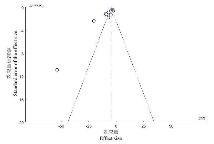 在RevMan 5.4.1软件上对文献使用留一法进行敏感性分析,未发现有能显著影响异质性指标的研究。结合文献数量及文献语言类型综合考虑,基于黄芪成分(黄芪多糖、黄芪甲苷、黄芪总皂苷、毛蕊异黄酮)影响AMY的相关文献制作漏斗图并进行Egger's test检验。漏斗图结果显示散点非两端对称,Egger's test检验结果为P<0.05,提示纳入文献存在一定的发表偏倚风险(图7)。