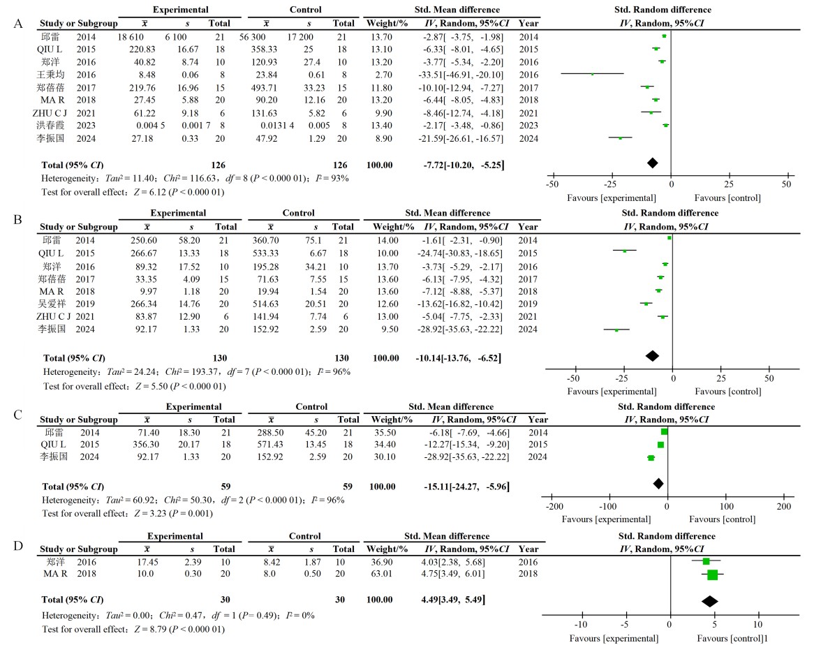| 图4 黄芪或其成分治疗急性胰腺炎后有关实验动物炎症因子的Meta分析森林图 |