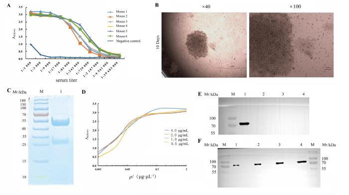 选取血清效价大于1∶10 000的免疫小鼠的脾细胞,采用麻醉后颈椎脱臼法处死实验动物,将小鼠尸体完全浸没在75%乙醇溶液中消毒8 min。在已紫外消毒的超净工作台内,将消毒后的小鼠固定于解剖板上,沿腹中线依次剪开皮肤和肌层,使用无菌器械仔细分离并摘取脾脏,并将脾脏转移至预冷的无血清RPMI-1640培养基中。去除脾脏被膜及周围结缔组织后,将脾脏组织平铺于细胞筛网上,用10 mL无血清培养基润洗,以无菌注射器活塞轻柔研磨使细胞通过筛网,收集细胞悬液至15 mL离心管中,最终获得单细胞悬液用于后续融合实验。骨髓瘤细胞和小鼠脾细胞在50%聚乙二醇溶液的作用下进行细胞融合。融合过程中,前30 s使用1 mL移液器以45°角沿管壁缓慢滴加37 ℃预热的50% 聚乙二醇溶液,后30 s改为边加边旋转混匀的方式,维持细胞悬浮状态。在20% HAT选择培养液中对融合细胞进行培养。10 d后,采用ELISA对杂交瘤细胞的培养液进行检测,以P/N≥2.1作为阳性判定标准,筛选出阳性杂交瘤细胞。随后对阳性杂交瘤细胞进行3次亚克隆筛选,得到阳性单克隆细胞株。