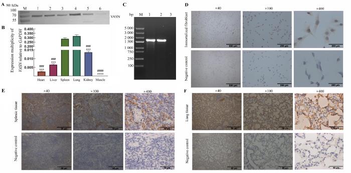 蛋白质印迹法结果显示,抗树鼩VASN单克隆抗体与树鼩的主要器官组织(心脏、肝脏、脾脏、肺脏、肾脏、肌肉)蛋白均可发生特异性反应,在分子量约70 kDa位置出现一条明显的条带,且背景清晰(图4A)。通过实时荧光定量PCR法检测树鼩主要器官组织中VASN的表达水平,结果显示树鼩脾脏组织和肺脏组织中基因VASN的mRNA相对表达水平较高(P<0.05,图4B)。免疫组织化学结果显示,该抗体特异性良好。在树鼩永生化成纤维细胞中,VASN蛋白定位于细胞质中,呈棕黄色阳性信号(图4C);在树鼩脾脏组织(图4D)和肺脏组织(图4E)中,可同样检测到棕黄色阳性信号;而在mRNA相对表达水平较低的心脏和肝脏组织中,免疫组织化学检测结果为阴性,所有阴性对照组(不加一抗)的检测结果也均为阴性。