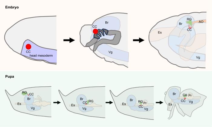... 果蝇心侧体是一种与脊椎动物胰腺α细胞同源的神经内分泌腺,始于果蝇头部中胚层(head mesoderm)[20].随着胚胎期发育的推进,心侧体祖细胞(progenitors)经历一系列形态变化,在延长的原肠胚阶段(extended germ band stage),心侧体的祖细胞形成每簇包含6~8个细胞的一对细胞簇,位于原脑(protocerebrum)内表面与前肠之间.当毗邻原脑时,心侧体的祖细胞直接与神经前体细胞(neural precursors)接触,而这些神经前体细胞将发育成脑部的中间神经节(pars intercerebralis),其神经元在后期可支配心侧体[21].在原肠胚回缩期间(germ band retraction),心侧体的祖细胞数量增加并向后迁移,穿过脑部的腹侧神经束并附着于咽侧体(corpus allatum)和前胸腺(prothoracic gland)的原始基团上[22].在背闭合(dorsal closure)过程中,心侧体咽侧体和前胸腺围绕前主动脉移动,最终形成环腺(ring gland)[23](图1). ...