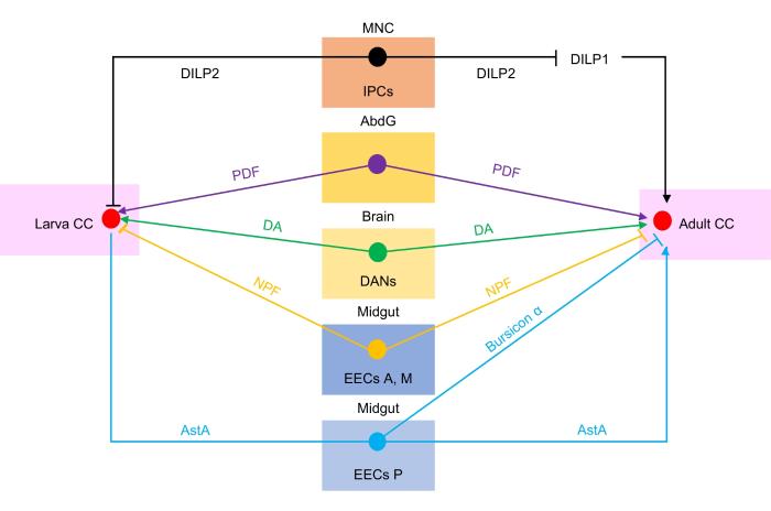 ... 在果蝇中,脑产生的神经递质多巴胺(dopamine,DA)和肽激素如色素分散因子(pigment-dispersing factor,PDF)可通过复杂的机制参与对心侧体细胞的调控,进而影响AKH的释放.研究表明,脑产生的DA在低血糖条件下可通过增加心侧体中细胞钙信号来促进AKH释放,其作用依赖于DA受体的激活.然而,蜕皮激素能够完全阻断细胞钙信号的增加,表明二者在心侧体中以拮抗的方式共同调节AKH的产生[45].此外,腹部神经节产生的PDF通过其色素分散因子受体(pigment-dispersing factor receptor)在心侧体中可增加cAMP水平,从而促进AKH的释放,这种调节作用可能与昼夜节律无关,而是通过非生物钟相关的机制来影响代谢过程[46].这些发现揭示了DA和PDF在代谢调控中的重要作用,表明它们通过与蜕皮激素相互作用,共同调节果蝇的代谢状态和行为响应. ...