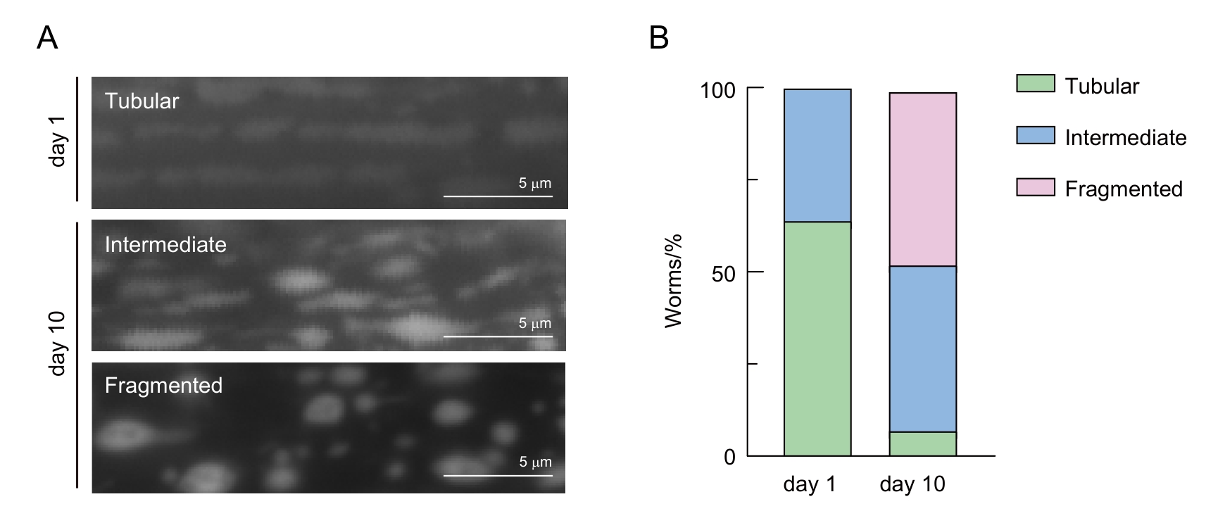 图3 线虫肌肉细胞线粒体形态分类 注:A,年轻线虫(day 1)和年老线虫(day 10)不同线粒体形态的代表性照片。B,线粒体形态随年龄的定性分析结果,绿色、蓝色和粉色分别代表管状(tubular)、中间态(intermediate)和碎片化(fragmented)线粒体线虫占总数的百分比。