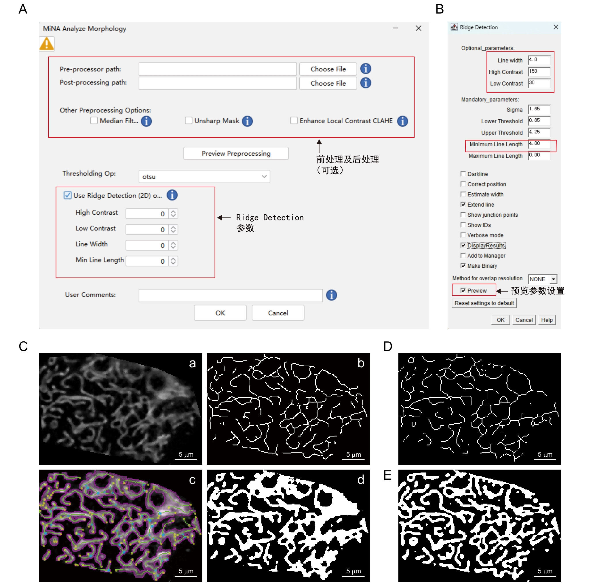Figure 5 Procedures and annotations of MiNA - Mitochondrial Network Analysis plugin Note: A-B, Plugin operation interface. C, Schematic diagram of the software processing workflow. The pre-processed image (a) undergoes binarization via the auto thresholding method (Auto threshold-Otsu) to extract mitochondrial contours (b). Using the parameters set for Ridge Detection in (B) to obtain the skeleton image (c). Relevant parameters are calculated from both the binarized image and skeleton image, and a contour map (d) is produced. D, Skeletonize algorithm(Skeletonization). E, Mitochondria Analyzer binarization algorithm.
